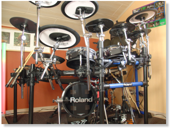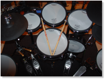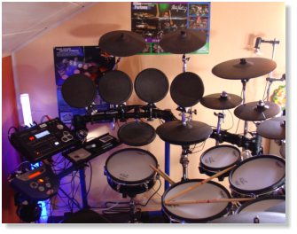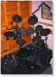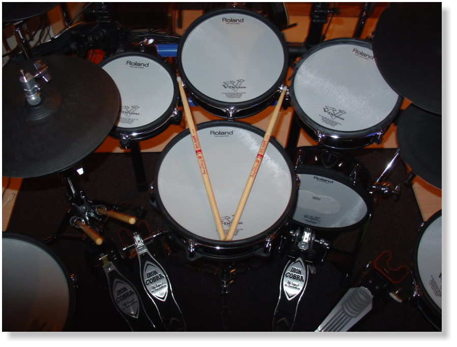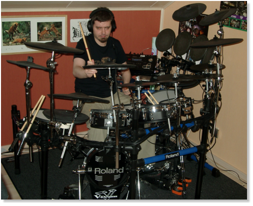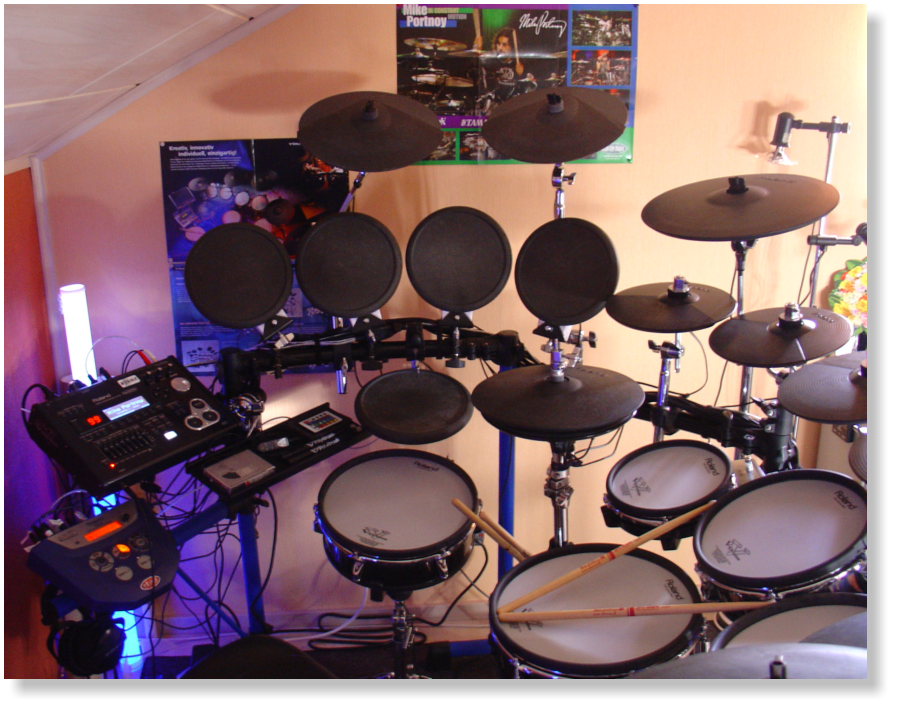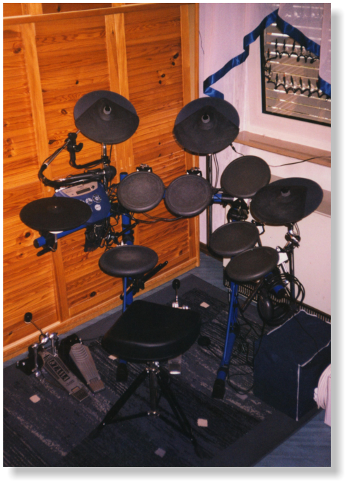 Musik-Kurs eine Band gegründet. Im Jahre 2001 habe ich dann mein erstes eigenes Schlagzeug gekauft. Ich habe mich für ein E-Schlagzeug entschieden um meine Mitmenschen und mein Gehör zu schonen: Ein Schaufenster-Ausstellungsstück des