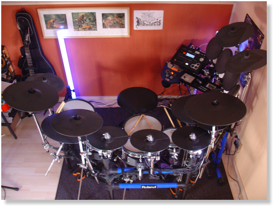 einzurichten. Somit zog das mittlerweile acht Jahre alte Drum-Kit auf den Speicher um. Hier hatte ich nun wieder jede Menge Platz für Erweiterungen. In der Hoffnung nach der