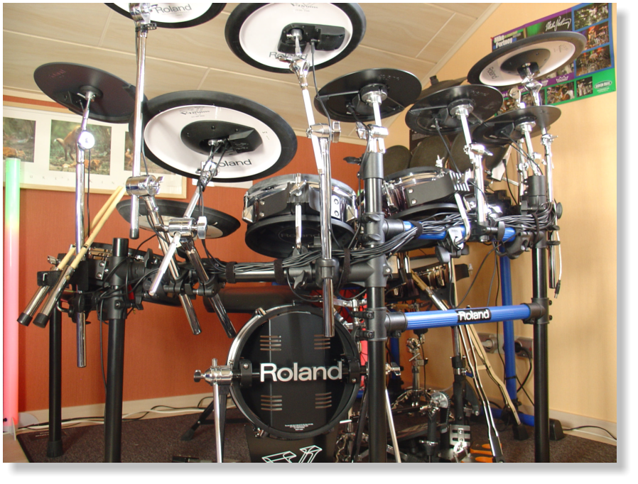 blauen Roland TD-6K V-Drum-Kits. Anhand von gekauften Noten, Abschauen von Könnern am Drum-Kit sowie einfachem Ausprobieren und viel Üben habe ich