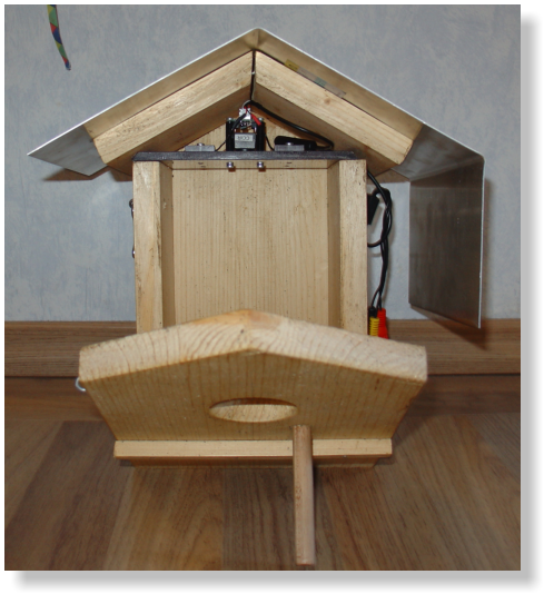 eingebaut. Die Elektronik ist vom Innenraum des Vogelhäuschens durch eine Plexiglas-Scheibe getrennt.