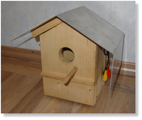 innen) habe ich einen kleinen 3,5" Flachbildschirm von einer PKW-Rückfahrkamera installiert. Jetzt kann man dort am Bildschirm das innere des Vogelhäuschens beobachten... Natürlich kann