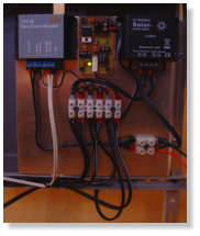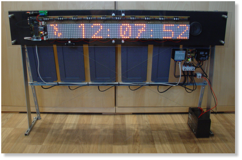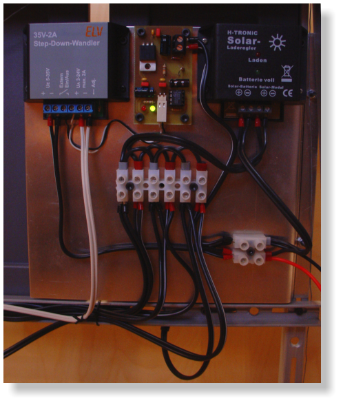 Über einen fertigen Solarladeregler wird der Bleigel-Akku geladen. An den Akku ist dann ein Abwärtssteller (Bausatz von ELV) angeschlossen, der die Funkuhr mit der nötigen Spannung