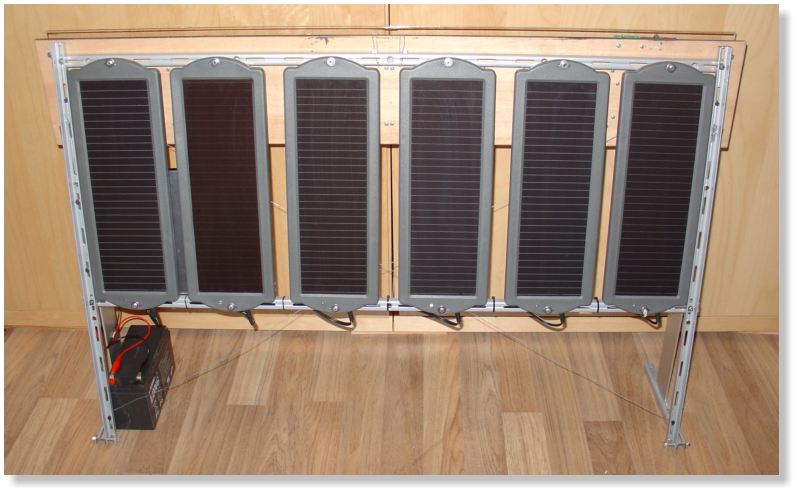 ich mal günstig gekauft. Sie sind eigentlich dafür gedacht, die Autobatterie über den Zigarettenanzünder zu laden bzw. vor Entladung zu schützen. Jede der 6 Solarzellen liefert bei guter Sonneneinstrahlung 1,5 Watt. Das genügt für die Uhr, welche etwa 5 Watt (bei eingeschalteter Anzeige) benötigt. Also habe ich die