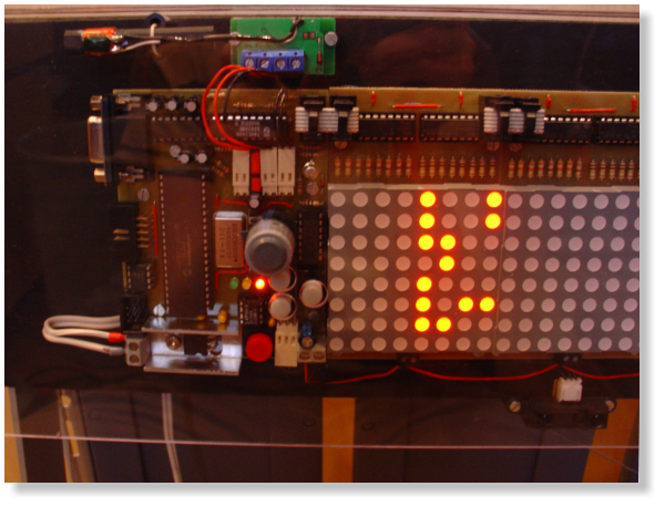 Am 08.11.2012 habe ich die Funkuhr endlich fertiggestellt. Die Software wurde nochmals überarbeitet und optimiert. Die einzelnen LED-Module sowie das DCF-Modul, der Abstandssensor, der Lautsprecher und die Hauptplatine wurden auf einer schwarz gestrichenen Holzplatte montiert. Vor den Platinen befindet