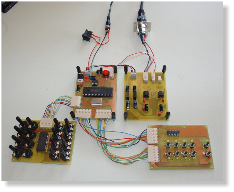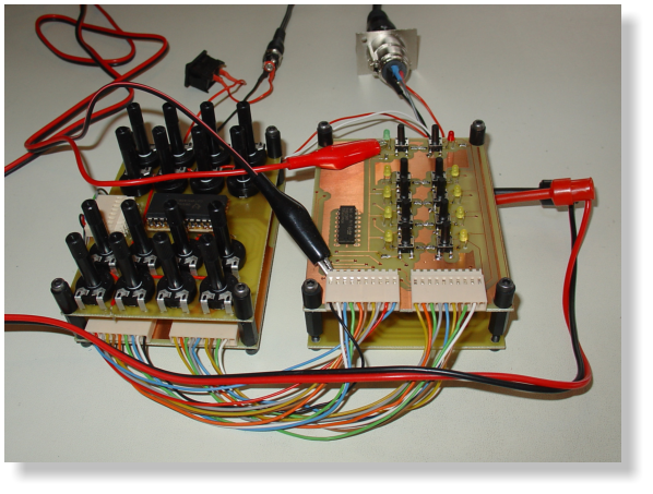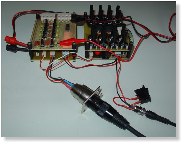 Das Bild oben links zeigt den Aufbau: Links ist der Anschluss zum PC (RS232) und die Buchse für die